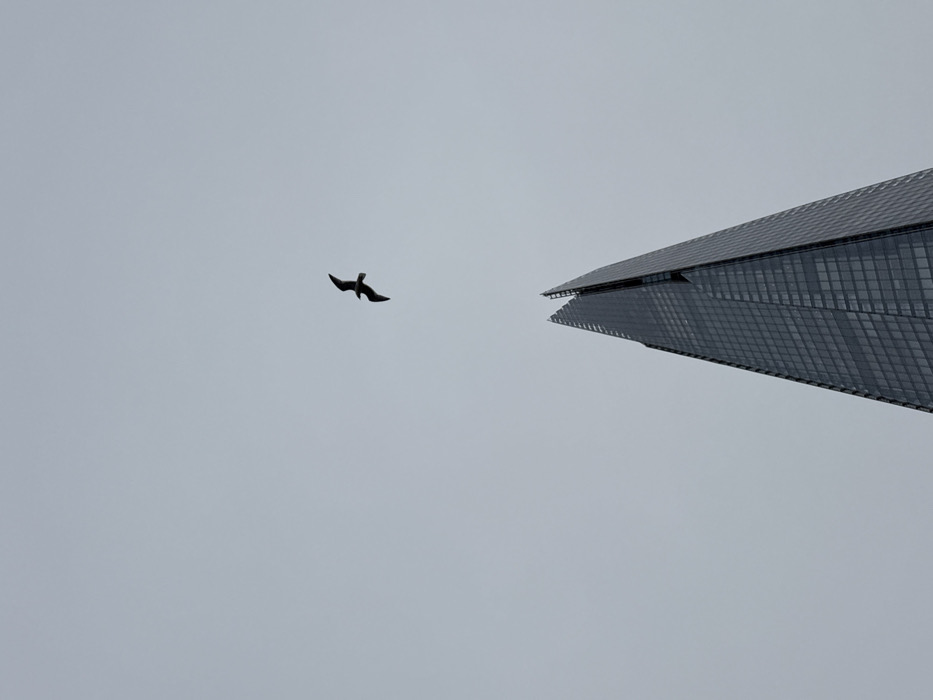 The image presents a low-angle view of the upper section of The Shard skyscraper, located in London, United Kingdom. The building's dark, multifaceted glass and steel structure, tapering to a sharp apex, occupies the lower right portion of the frame. The sky above is uniformly light grey, indicating an overcast environment. A single bird, appearing as a dark silhouette with outstretched wings, is captured in flight in the upper central-right area of the frame, positioned above the skyscraper's peak. No human figures or other discernible objects are present.