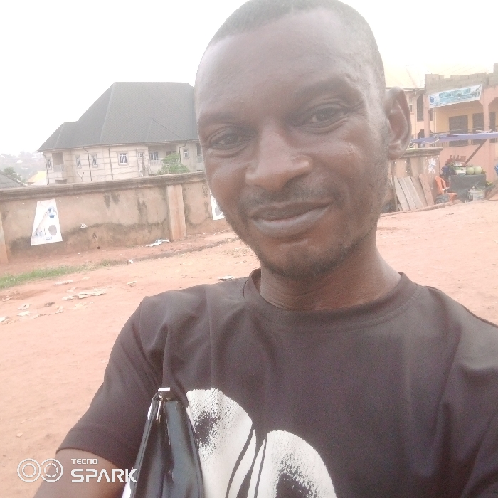 A close-up selfie captures a man outdoors, with a dirt road setting the backdrop. A building behind a wall sits to the left, and a building with an advertisement is visible in the distance on the right. The man sports a dark t-shirt, while holding a bag in the lower-left corner. The image includes a "Tecno Spark" watermark at the bottom.