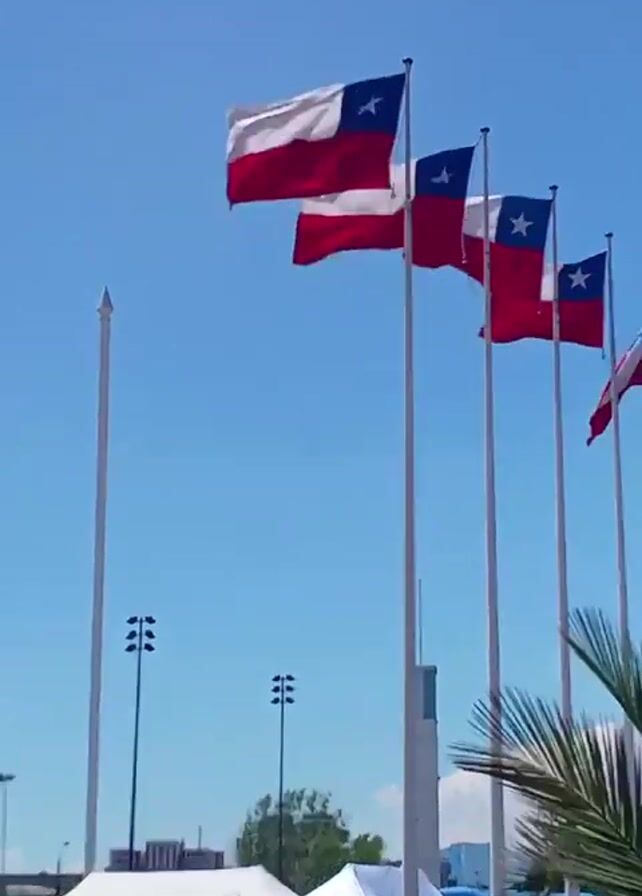 view of a public outdoor gathering on a clear, sunny day. In the foreground, there are several people walking. A woman wearing a red and pink outfit passes by on the left, and a man in a yellow shirt walks on the right. In the background, several flags of Chile are waving from tall poles. White tents are set up in the distance, and there are several groups of people milling around. There are also tall light poles, a tall white tower, and palm trees.