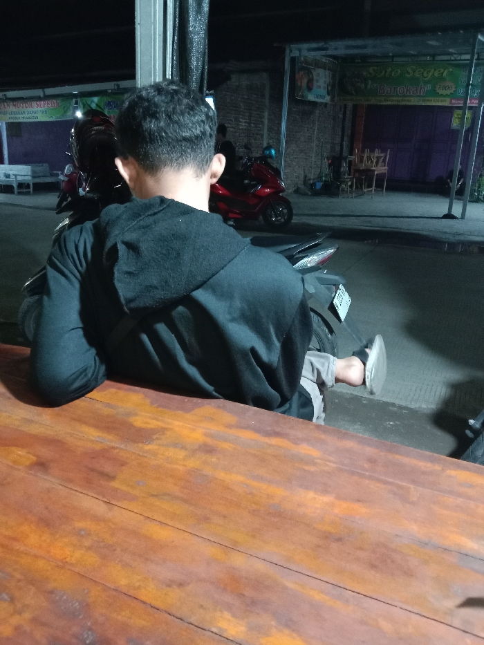 The image depicts a nighttime roadside scene in Ketapang, Indonesia, observed from behind a seated individual. In the immediate foreground, a weathered, reddish-brown wooden table occupies the lower portion of the frame. A person, appearing male, is seated at this table with their back to the viewer, wearing a black hooded sweatshirt and light-colored shorts. Their left foot, shod in a light-colored sandal, is visible dangling. Directly behind the seated individual, a black scooter or motorcycle is parked, facing right, with an Indonesian-style license plate partially visible on its rear fender. The ground is a paved or concrete surface. Further into the midground, a red scooter, possibly a Honda PCX, is parked facing left. The background features two illuminated roadside establishments. On the right, a stall with a corrugated metal roof extension displays a green banner with white text, which includes "Soto Seger Barokah" and "7.000," indicating a food vendor. Stacked wooden chairs and tables are visible inside this area. The wall behind the banner appears to be unpainted brick. On the left, another structure with a lighter-colored wall features white benches and a partially visible banner containing the text "PENJUALAN MOTOR SEPEDA" (Motorcycle Sales). The scene is illuminated by artificial light sources, casting shadows.