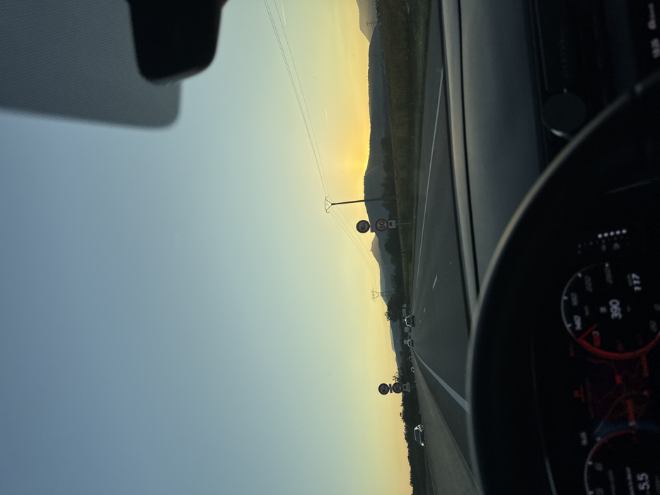 - "The image depicts a first-person perspective from the driver's seat of a vehicle traveling on a multi-lane highway near Sélestat, France, during sunset" by FM-QjpWv1, licensed under CC BY 4.0