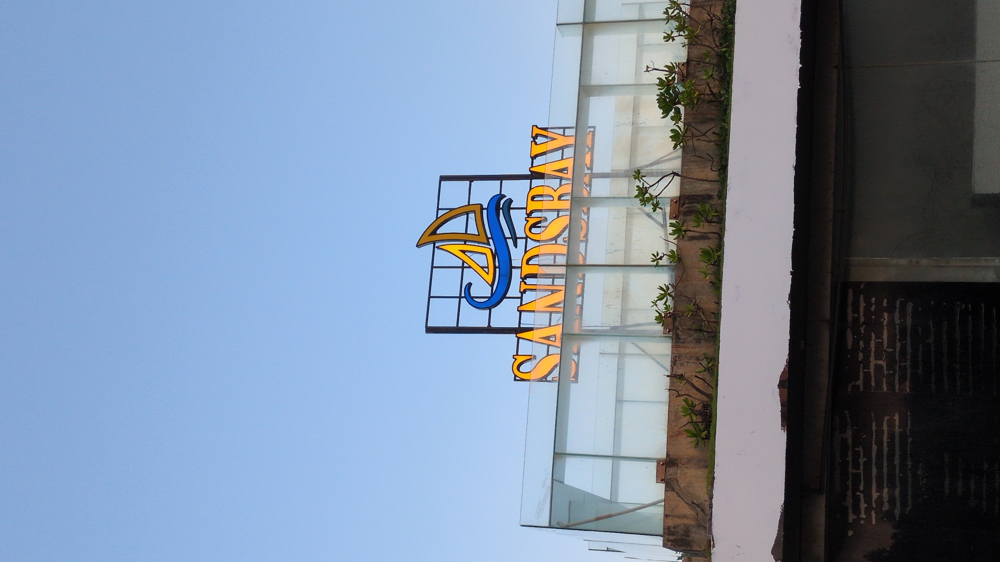 Sands Bay hotel sign against a blue sky in Tuy Hòa, Vietnam. The sign is mounted on a metal grid atop a building with glass panels. The letters "SANDS BAY" are visible, with the initial symbol in gold and blue. Small plants grow along the edge of the building near the sign. A portion of the building's facade is visible on the right, consisting of a white painted section, glass panels, and a dark, patterned area.