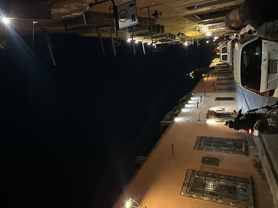 A nighttime street scene shows cars parked on a narrow road beside buildings with barred windows. A motorcycle is parked close to the right foreground. Lights illuminate the buildings, and a street sign indicating parking is visible. The sky is dark and clear. A person is seen slightly in the top right corner.