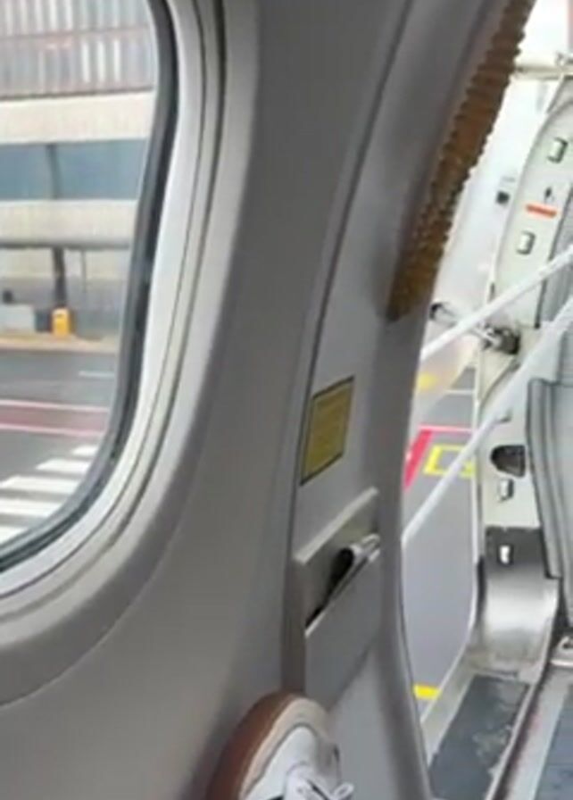 n interior view from an airplane. The plane door is open, revealing a view of the airport terminal. A person wearing black pants, a bright orange safety jacket with black sleeves, and black shoes enters the frame, stepping inside the airplane. They are carrying documents on a clipboard. The interior of the plane is white, and the door is gray. A white and black Adidas shoe is visible at the bottom left of the frame.