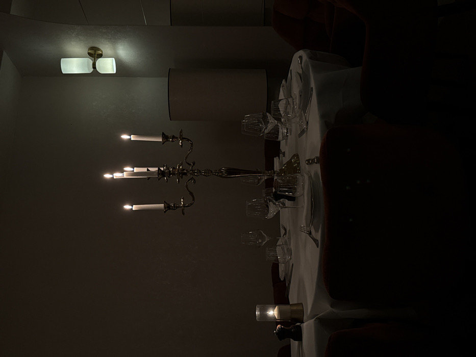A dimly lit dining area showcases a lavishly set table. A white tablecloth drapes over the surface, adorned with fine glassware, plates, and silverware. A tall candelabra with lit candles serves as a centerpiece, casting a soft glow. A small lamp in a glass case adds to the ambiance. Plush red chairs surround the table, hinting at a luxurious dining experience. The background is muted, emphasizing the table's elegance. A modern ceiling light provides subtle illumination.