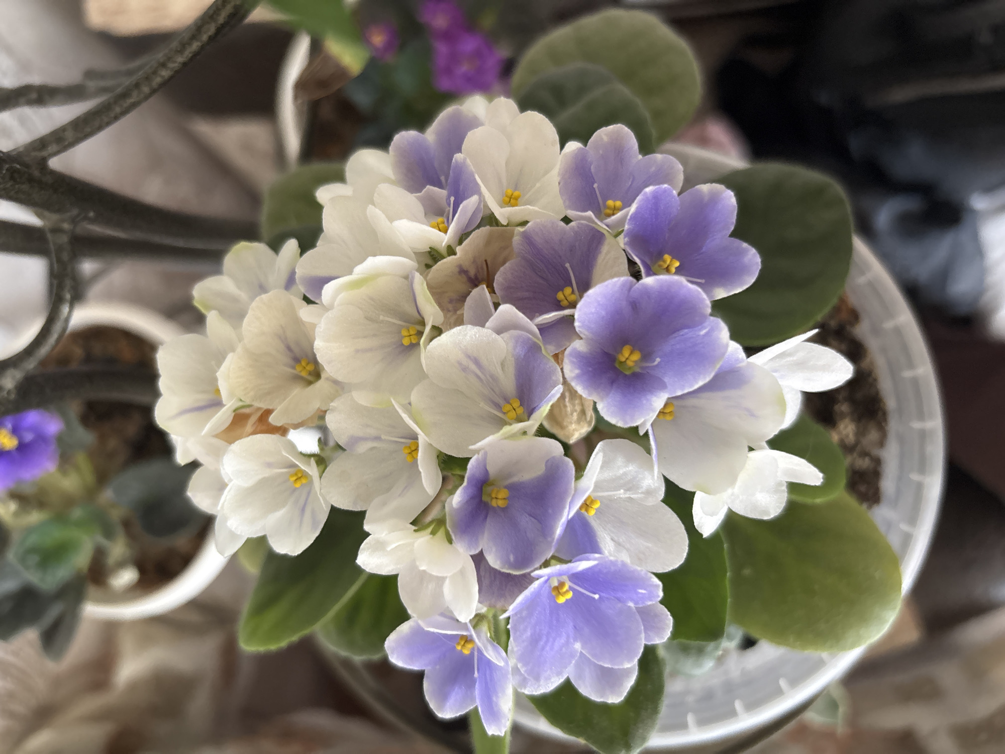 cluster of African violets in full bloom. The flowers are a mix of white and light purple, each with a yellow center. The plants are potted in white plastic containers, and the leaves are a deep green. The setting appears to be indoors, with hints of other plants and objects in the background. There is no indication in the image that it is from the city of Osa, Russia.