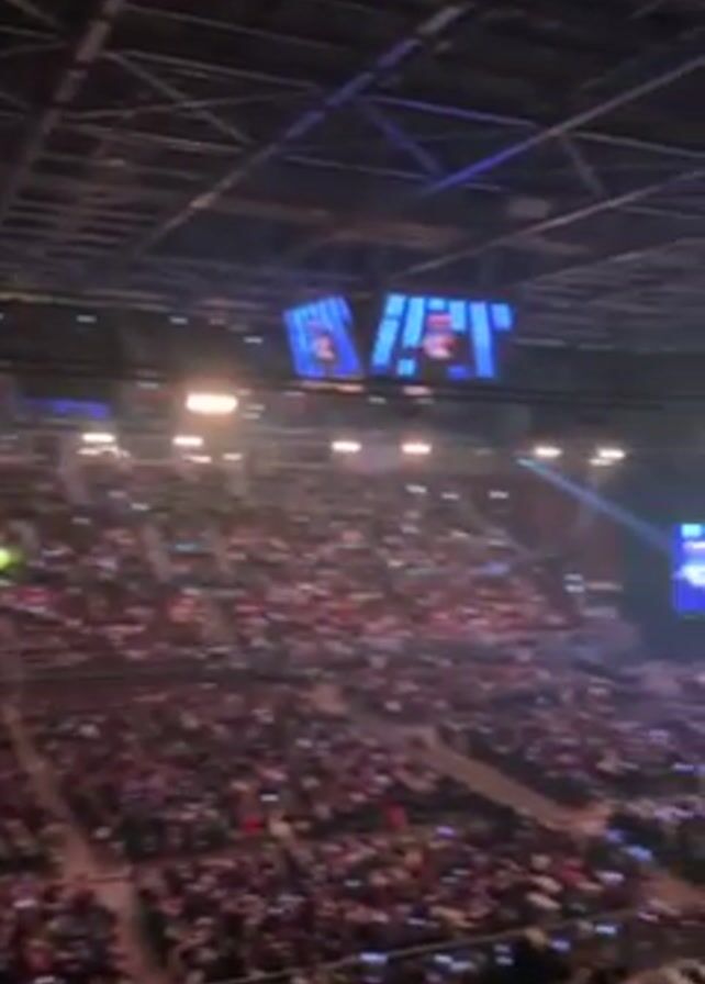 From an elevated position in an indoor arena with a high, exposed ceiling, a large crowd of people is seen watching a musical performance on a brightly lit stage. The stage is elevated with a small set of stairs leading to a main platform area, and the backdrop features a bright circular design. Screens flank the stage, displaying images of the performer. Many attendees are holding up their phones, presumably recording or taking pictures of the performance. The arena is packed with people filling the tiered seating.