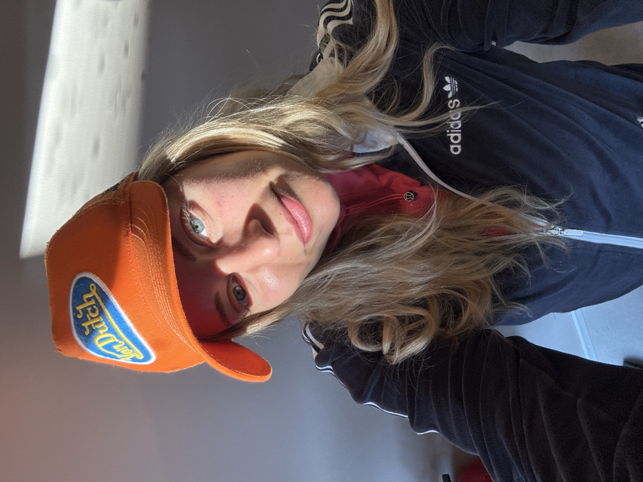 A young adult female is depicted in a self-portrait, captured indoors in Roubaix, France. She gazes directly at the camera with a slight smile. Her left eye is blue, and her right eye is green/hazel. She has long, wavy blonde hair. She wears an orange Von Dutch trucker hat, displaying a blue and yellow oval logo on the front. Her attire includes a dark blue velour Adidas tracksuit top with white sleeve stripes and a white Adidas Originals logo on the left chest, partially unzipped to reveal a pink hooded garment underneath that bears a small black and silver circular logo. Direct sunlight illuminates the subject's right side and casts distinct linear shadows on the plain, light-colored wall behind her.