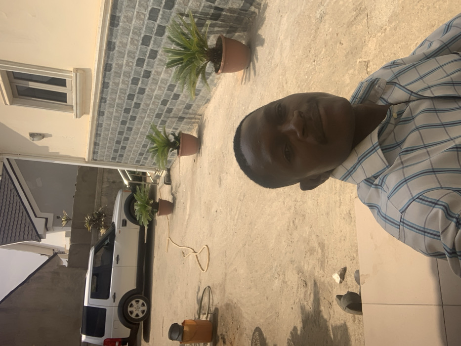 An outdoor scene depicts an adult male in the foreground, looking directly at the camera. He has a dark complexion, short dark hair, and a mustache, wearing a light-colored plaid long-sleeved shirt with blue and white squares, unbuttoned at the collar. The setting appears to be a residential courtyard or driveway in an Unknown city, Nigeria. The ground is a light-colored, possibly concrete or dirt, surface that appears dry. To the man's right, a building wall is visible, with a cream-colored upper section featuring a rectangular window with a light frame and a wall-mounted light fixture. The lower section of this wall is clad with dark and light grey rectangular tiles or blocks. Three potted plants, resembling sago palms, are arranged diagonally along the right side of the ground, each in a brown terracotta-style pot. Further left, a yellow plastic bucket with a dark lid sits on the ground, next to a loosely coiled, light yellow garden hose. In the background, a silver or white Land Rover Discovery SUV is parked on the left side of the frame, facing right. Behind the parked vehicle, a low wall or fence is visible, beyond which parts of other modern residential buildings with sloped dark roofs and light-colored walls are present. The sky is clear and light blue, indicating bright daylight. Shadows are cast by objects, suggesting a high sun angle.
