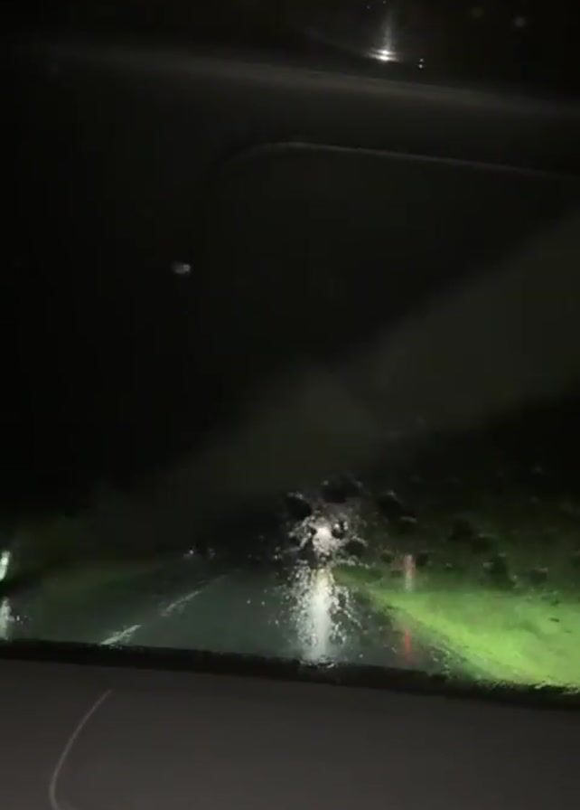 A car is driving down a dark, rainy road at night