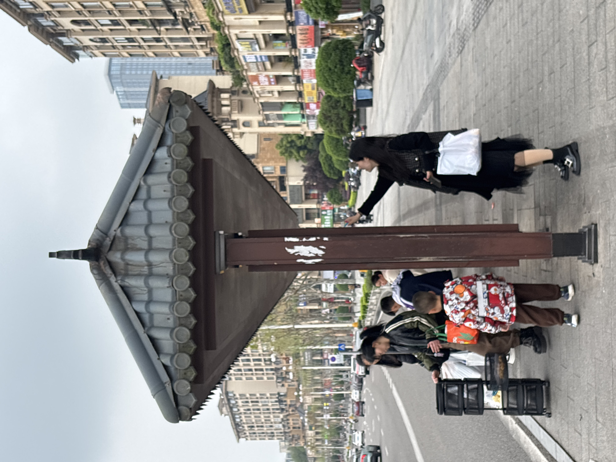 The image captures an urban street scene in Jiangjin, China, under an overcast sky. In the mid-ground, a bus stop shelter with a dark, traditional Chinese-style tiled roof and decorative eaves is supported by dark brown pillars; the front-right pillar exhibits white markings. Seven individuals are visible near the shelter. On the far right, a female, dressed in a black coat, black dress, light-colored stockings, and black buckled boots, holds a white plastic bag in her left hand and extends her right index finger upwards and to the right. A young boy, approximately 5-7 years old, stands with his back to the viewer, wearing a red and white cartoon-patterned jacket with a reflective stripe, brown pants, and sneakers. To his immediate left, an adult in a dark jacket with green and yellow stripes on the sleeves and dark boots stands next to a black, three-tiered rolling cart containing items. This individual also holds an orange plastic bag. Three to four additional individuals are partially visible further left, under the shelter, some appearing to be seated. A multi-lane asphalt road with white lane markings occupies the left side of the frame, showing active vehicular traffic including multiple cars. A median strip with trees and bushes separates traffic lanes. Across the street, multi-story buildings with various architectural styles line the street, featuring commercial storefronts displaying Chinese character signage, alongside residential structures. Several motorcycles and scooters are parked on the opposite sidewalk. A taller, modern glass-fronted building is visible in the background. The foreground sidewalk is paved with grey tiles, incorporating tactile paving strips.