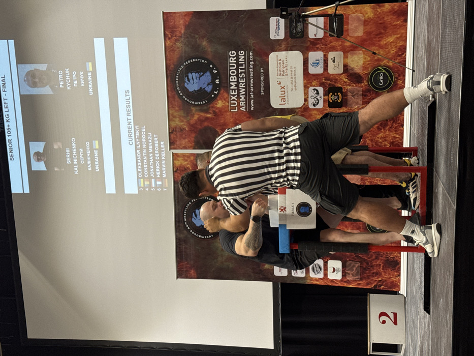 An arm-wrestling match is underway, overseen by a referee in a striped shirt. Two competitors face off at a table labeled "TABLE 1." A screen displays "Senior 105+ KG Left - Final" results, listing Serhii Kalinichenko and Petro Kychuk from Ukraine. "Current Results" show Oleksandr Ilnytskyi in third place, followed by Constantin Norocel, Jonathan Menazli, Herick Derobert, and Marvin Keller. A backdrop features the "Luxembourg Armwrestling" logo and sponsors like Lalux Assurances and Grillo.