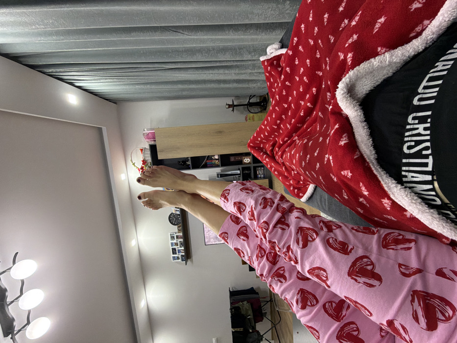 Two individuals are relaxing indoors, likely in a living room in Plovdiv, Bulgaria. The foreground features the elevated bare feet and lower legs of one individual, wearing light pink pajamas adorned with red heart patterns. The toenails are painted dark red. To the right, another individual's legs are partially visible, covered by a red fleece blanket with white patterns and a white sherpa lining; a black garment beneath the blanket displays the word "CRISTIANO" in white capital letters. The individuals appear to be reclining on a dark grey sofa or bed. In the background, a modern living space is visible. To the far left, a clothes drying rack is partially obscured. Centrally, a wall-mounted television screen is visible below a dark floating shelf displaying framed photographs and a round clock. To the right of the TV, a tall, narrow, light wood-paneled cabinet stands adjacent to a dark shelving unit containing items including a white PlayStation console. On top of this unit, a white basket holds red flowers. A black hookah is positioned on the floor near a wall covered by light grey pleated curtains. The ceiling is white with recessed lighting and a modern three-light fixture. The walls are light grey.