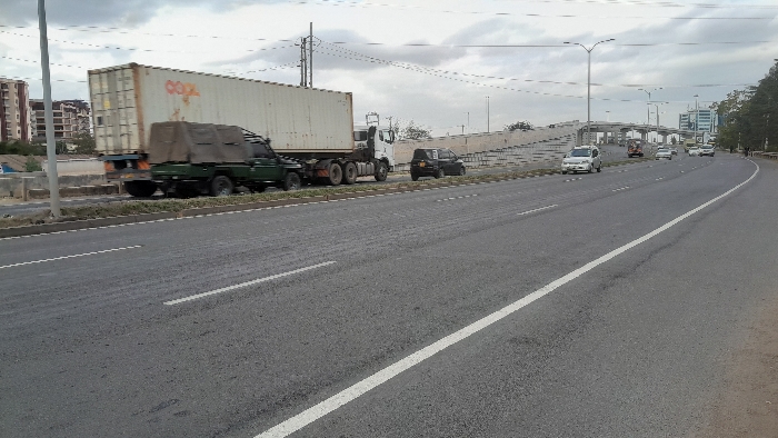 An asphalt highway stretches into the distance, showcasing several vehicles on the left side. A large truck hauling a shipping container and a smaller military-style vehicle, both parked. Further down, a black SUV sits near a concrete barrier. In the distance, a white van and other cars are on the road. Overhead, streetlights illuminate the highway. Above, there are many clouds.