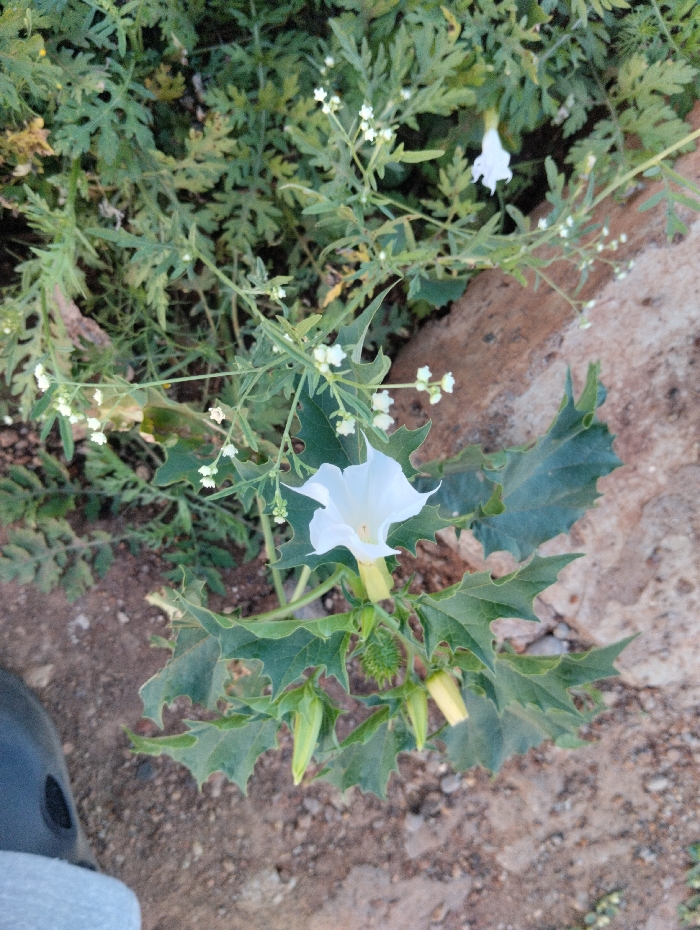 The image captures a white trumpet-shaped flower, prominently displayed with its green, pointed leaves. Several unopened buds are visible around the central bloom. The plant grows amidst other greenery, including smaller plants with tiny white flowers. Soil and a grey object, likely part of a shoe, frame the bottom left. A rock or concrete surface appears on the right side of the frame.