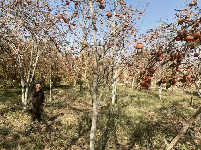 The image depicts a rural orchard in Bazar-e Panjva'i, Afghanistan, under a clear blue sky