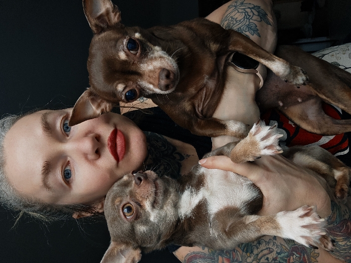 The image depicts a close-up, indoor portrait featuring an adult individual with two small dogs. The precise location within the city of Saint Petersburg, Russia, is not discernible from the visual evidence; the background is a uniformly dark, featureless surface, suggesting an indoor setting. The central figure is a light-skinned individual with blue eyes, red lipstick, and grey hair pulled back from the face. Extensive dark-ink tattoos are visible on both forearms, biceps, and across the neck. The individual is wearing a dark top, with a glimpse of red and white patterning visible on the left side. Their hands are holding two small dogs. The dog on the left has short, light brown and white fur, with brown eyes, and is looking slightly to the left of the camera. The dog on the right has short, dark brown fur, with large dark eyes, and is looking directly at the camera. Both dogs are held close to the individual's chest and face, facing forward towards the viewer. The individual is looking directly at the camera. No other objects or individuals are visible in the frame.