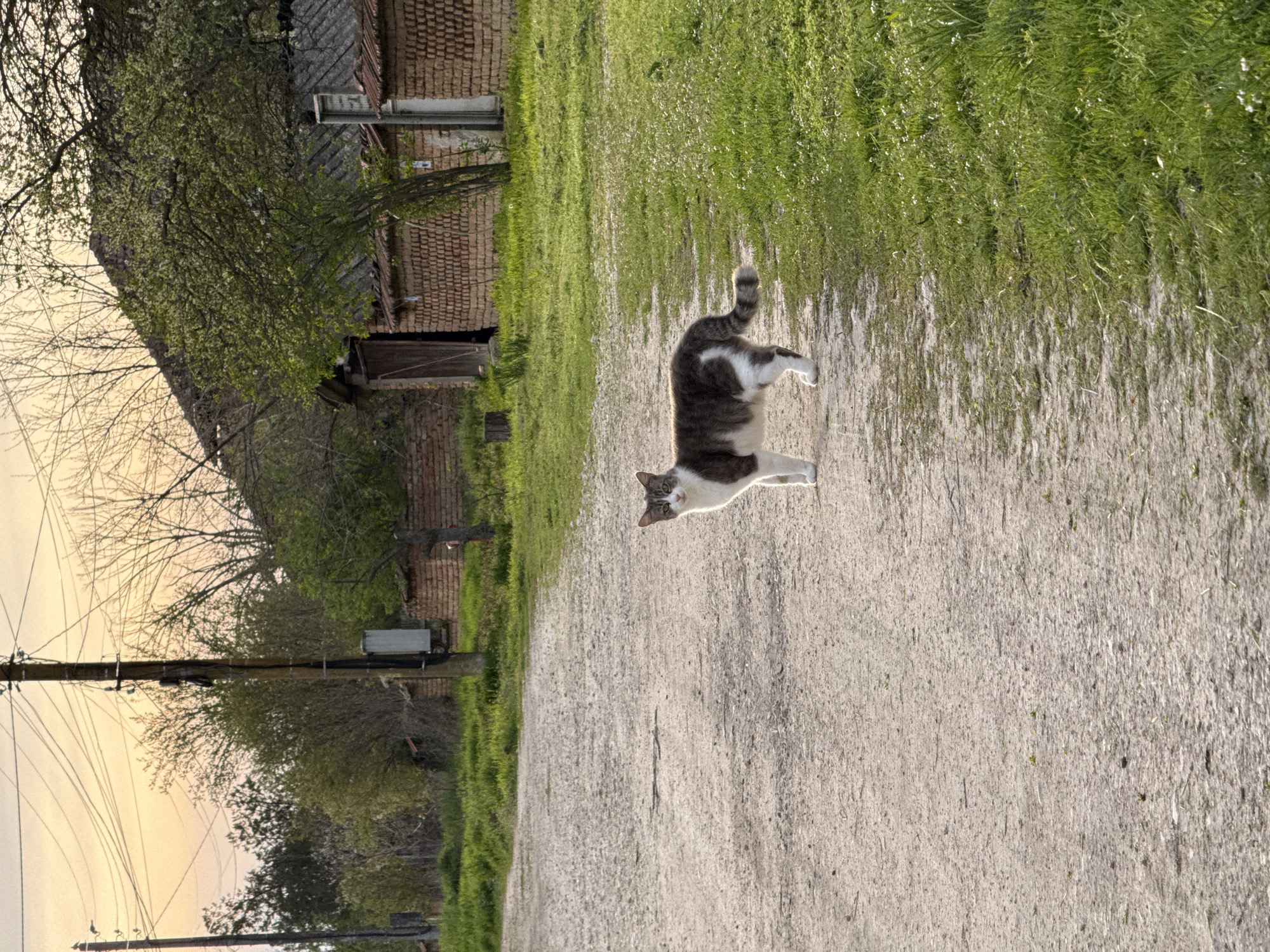 - "A medium shot depicts a gray and white cat standing on an asphalt road" by FM-LrMbX2, licensed under CC BY 4.0