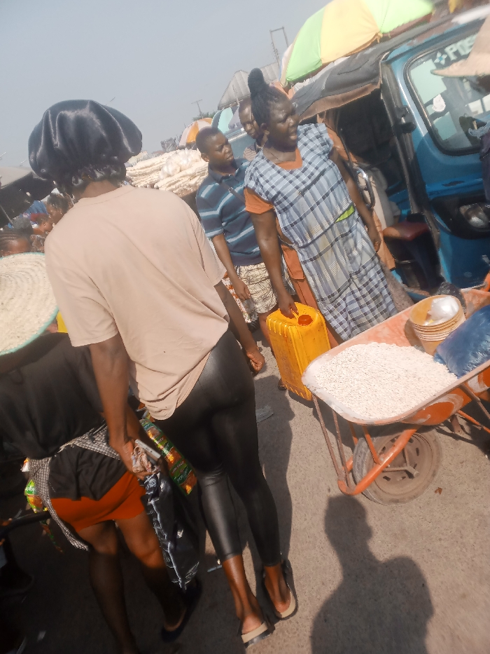 This image depicts a bustling outdoor market scene in Ughelli, Nigeria. In the foreground, a person with their back to the camera wears a black satin bonnet, a beige short-sleeved t-shirt, and shiny black leggings, with light-colored flat sandals. To their immediate left, a partially visible individual wears a black shirt, orange shorts, and dark leggings, carrying a bundle wrapped in colorful fabric. In the midground, an orange wheelbarrow is positioned on the right, filled with a large quantity of small white grains, along with several light-colored bowls and a blue bag. To the left of the wheelbarrow, a woman in a blue and white plaid dress, layered over an orange shirt, stands holding a yellow plastic jerrycan in her left hand, looking towards the right. Behind her, a man in a blue and white striped shirt and patterned shorts stands, looking towards the left. In the background, a blue tricycle taxi (Keke Napep) with a multi-colored umbrella attached to its roof is partially visible. Piles of white sacks or bundled goods are present throughout the background, indicating market stalls. The scene is brightly lit by sunlight, casting distinct shadows on the light-colored ground.