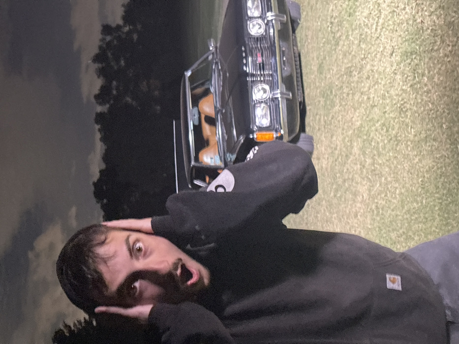 A startled man stands with hands over his ears, mouth agape, with wide eyes gazing at the camera. He is wearing a black hooded sweatshirt with a Carhartt logo. Behind him is a vintage black car with tan leather seats parked on a grassy area. The sky is overcast and the photo appears to be taken outdoors at dusk or night. Trees are visible in the distance.