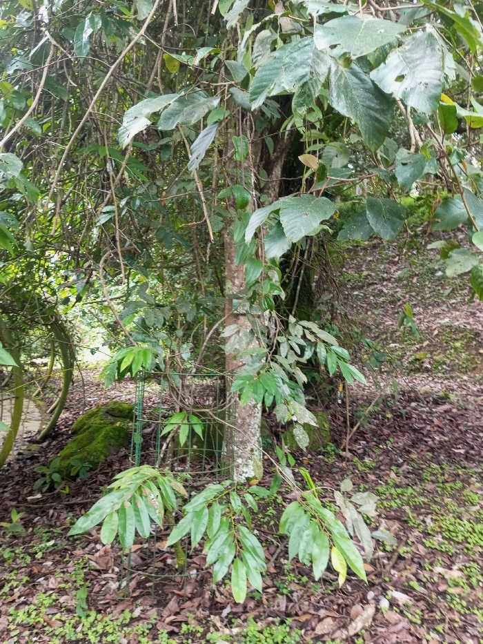 The image displays a verdant, densely vegetated area within the city of Kanand, India. A prominent tree trunk with light-colored bark stands slightly right of the center, surrounded by numerous green leaves and hanging vines. At the base of a smaller plant in front of this tree, a cylindrical green wire mesh cage is present. To the left, a large rock covered in green moss is visible, adjacent to a curved, light-colored structure, possibly a pathway edge. The ground is covered with a layer of brown fallen leaves, dirt, and sporadic green ground cover. No individuals or animals are present.