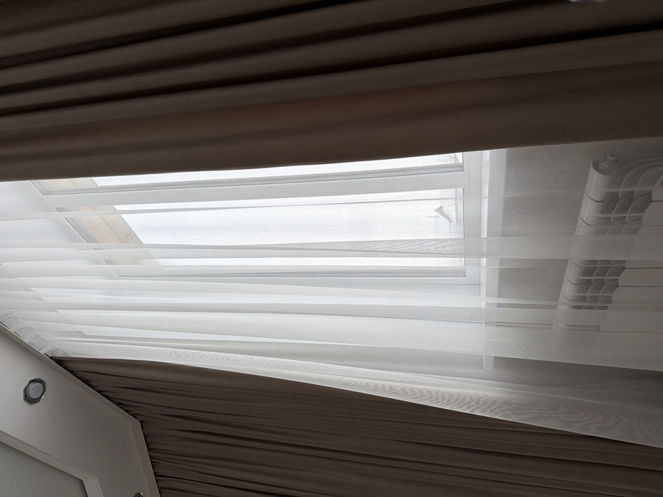 An interior scene in Ershov, Russia, presents a window arrangement from an inward perspective. The window is equipped with white-framed panes, primarily covered by a dual curtain system. A set of translucent white sheer curtains is drawn across the window, diffusing external light. These are flanked by opaque, pleated brown-taupe drapes, partially pulled to either side. A white ceiling with a single circular recessed light fixture is visible in the upper left quadrant. Below the window, a white, multi-finned radiator is mounted against a light-colored wall, partially obscured by the sheer curtain. Through the sheer curtains and window glass, faint, indistinct outlines suggestive of distant rooftops or structures are perceivable. No individuals are present.