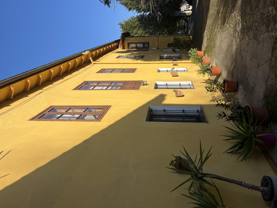 The image depicts a long, multi-story building located in Santa Cruz de Bezana, Spain, viewed from a slightly low angle. The building's exterior is painted a bright, uniform mustard-yellow or ochre, with a prominent diagonal shadow cast across its left half from an unseen object or adjacent structure. The roofline features decorative yellow eaves and a brown gutter. Numerous windows punctuate the yellow facade. On the upper sections, several tall, rectangular windows with dark brown wooden frames are visible. Below these, and further to the right, are additional windows: some feature white frames with black vertical security bars, while others are smaller with white frames. Several terracotta-colored potted plants containing various green foliage are placed on the ground along the building's base, and smaller terracotta pots with green plants are mounted on brackets on the wall. The ground in the foreground is a paved or concrete pathway, partially covered with moss or dirt, also displaying patterns of sunlight and shadow. To the far right of the building, a dense line of tall, dark green evergreen trees (likely conifers) and some bare tree branches are visible, indicating surrounding vegetation. The sky above is clear and bright blue. No individuals or animals are present in the scene, and no overt actions or interactions are depicted.