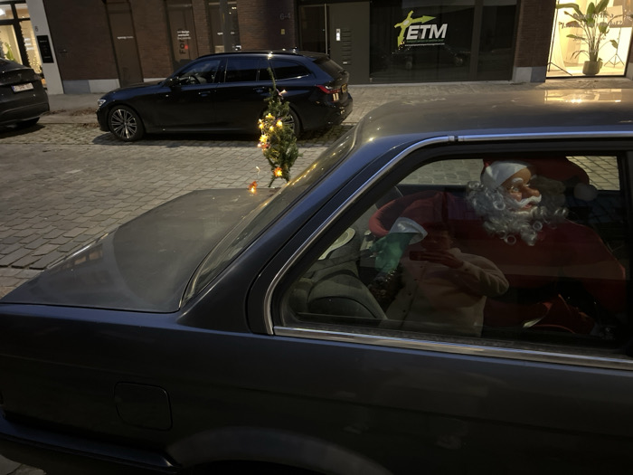 A dark car is parked on a cobblestone street. Inside, a Santa Claus figure sits in the driver's seat. A small Christmas tree decorated with lights is placed on the car's trunk. In the background, another black car is parked nearby, with a building visible further back featuring a sign that reads "ETM". The scene appears to be lit by streetlights at dusk.