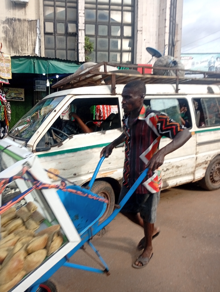 The image displays a street scene in Onitsha, Nigeria. A dark-skinned male, wearing a multi-patterned short-sleeved collared shirt and dark shorts, is observed pushing a blue-framed, two-wheeled display cart containing numerous light-brown, oval-shaped baked goods. He wears brown sandals and appears to be in motion. Behind him, a white passenger van with a green horizontal stripe is present. The van is equipped with a roof rack holding various items, including a dark sack, a red container, and a small satellite dish. A human arm is visible extending from the van's open front passenger window, and another individual, partially obscured and wearing red and white patterned clothing, is visible through a rear window. In the background to the left, a commercial storefront is visible beneath a green awning, displaying merchandise and illuminated by bright lights. A large, multi-story building with numerous square windows and weathered concrete surfaces stands prominently in the central background. The ground beneath the subjects is an unpaved, reddish-brown surface.