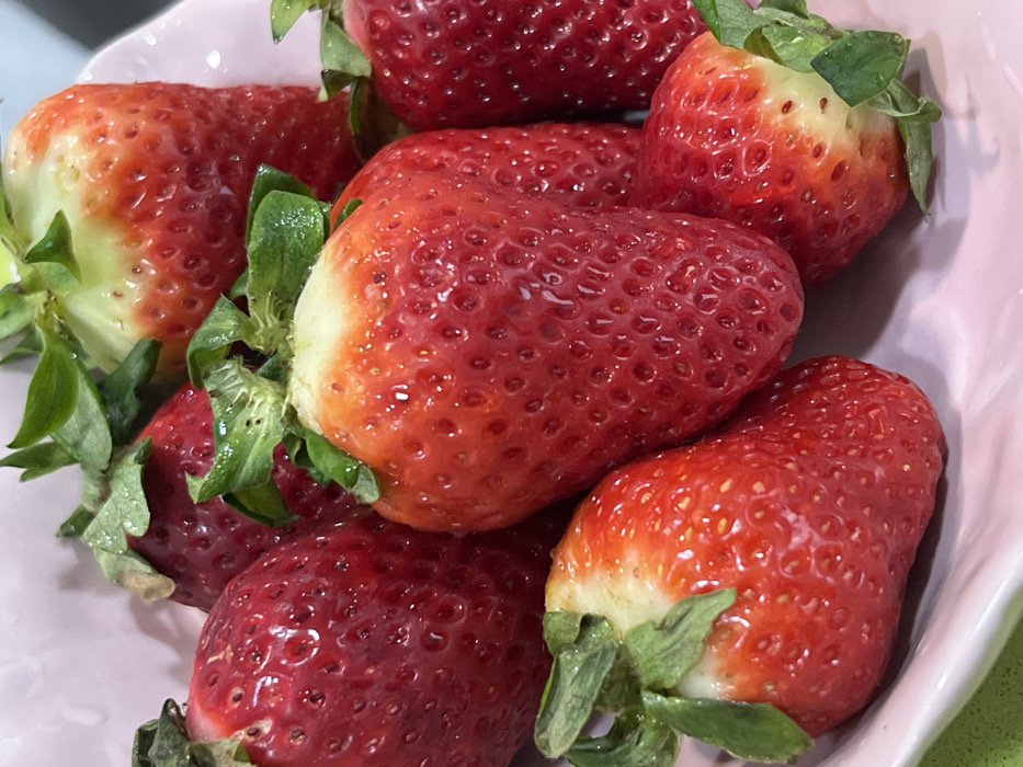 - "A close-up, high-angle view presents a collection of approximately ten strawberries contained within a light pink, possibly ceramic, bowl" by FM-Gp7zE3, licensed under CC BY 4.0