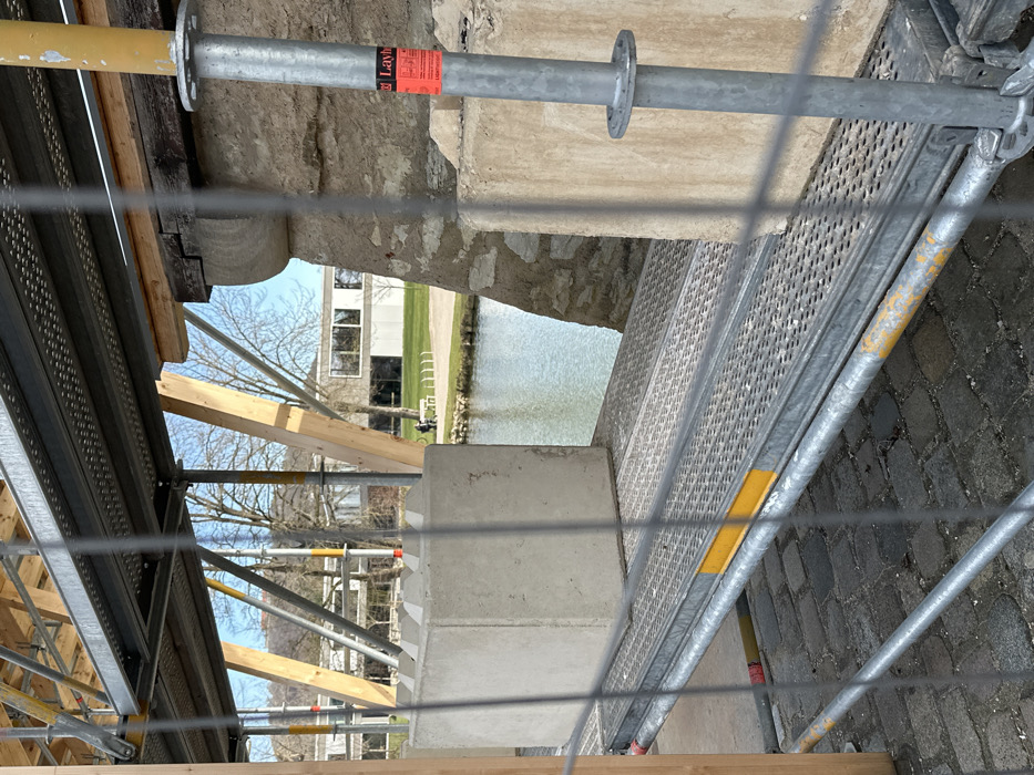 The image displays an active construction or renovation site in Weißenburg in Bayern, Germany, on a clear, sunny day. The foreground is occupied by a metallic mesh fence, through which the scene is viewed. Behind the fence, a cobblestone surface is visible. A multi-level metal scaffolding system, including vertical poles (one bearing a "Layher" sticker) and perforated metal platforms with yellow reflective strips, is prominent. On a central platform, a large, light grey rectangular concrete block with conical protrusions on its upper surface rests. The scaffolding system appears to enclose or support a weathered stone structure, possibly a historical bridge abutment or building foundation, partially visible on the right. In the midground, a calm body of water, likely a river or canal, reflects the bright blue sky. On the distant bank, a green grassy area features a bicycle rack, a white bench, and two distant human figures—one seated, one standing. Further back, modern buildings with large windows are visible amidst bare trees, with distant hills under a clear blue sky.