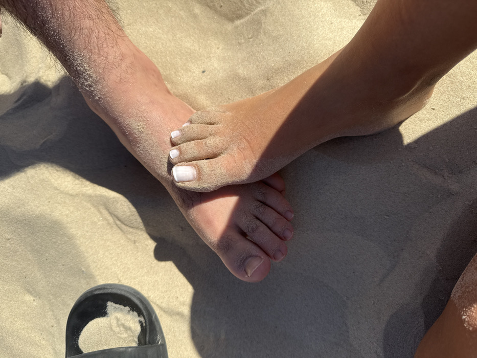 - "The image displays a close-up, high-angle view of two pairs of bare feet partially covered in light-colored sand on a beach in Tel Aviv, Israel" by FM-czIJz2, licensed under CC BY 4.0