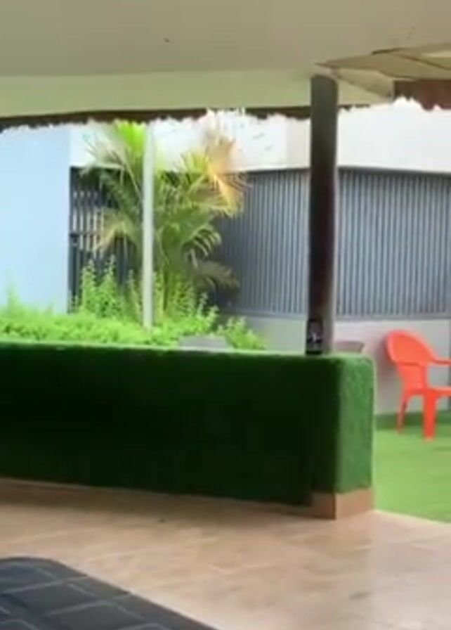 A person in a black t-shirt and baggy jeans walks into a tiled patio area. They pause in front of a column, bending over to look at something on the column. The column is next to a rectangular planter box covered in artificial turf. Behind the planter box is a small fenced-in area with green grass and a couple of bright orange chairs.