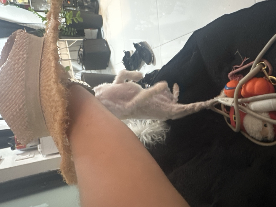 A close-up, upward-angled interior shot captures a human arm presenting a wide-brimmed, fringed straw hat. A small, white, short-haired dog stands on its hind legs, stretching upward towards the hat and arm, its fluffy tail visible. The dog is positioned on a dark upholstered surface, likely a couch or chair. Below the dog, a collection of objects is visible: a red and white Santa Claus plush toy, an orange rubber ball, another orange dog toy, and a grey leash with a brass-colored clasp, all tangled together. In the background, a light-colored tiled floor is visible, with two pairs of dark athletic shoes resting on it. Further in the background, out of focus, are dark rectangular speakers, potted plants in dark containers, and what appears to be a cabinet or shelf unit with bottles on top. The scene is consistent with a domestic living space. The specific location within Fort Lauderdale, United States, is not discernible from the image content.