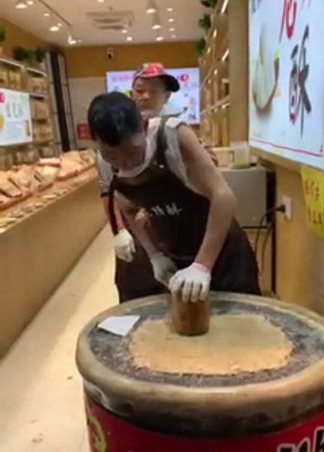 A man is shown using a wooden mallet to mash a beige substance on a large, round table in what appears to be a store. He is wearing a white sleeveless shirt, a dark apron, and white gloves. Another man, wearing a black shirt, dark apron, gloves, and a hat, is standing behind him, looking on. Behind the men are shelves full of packaged goods and a lit-up sign with Chinese writing. The store has bright overhead lighting and a polished floor. The man with the mallet lifts the mallet, then slams it down repeatedly. Afterward, he unplugs an electrical cord from an outlet on the wall behind him.