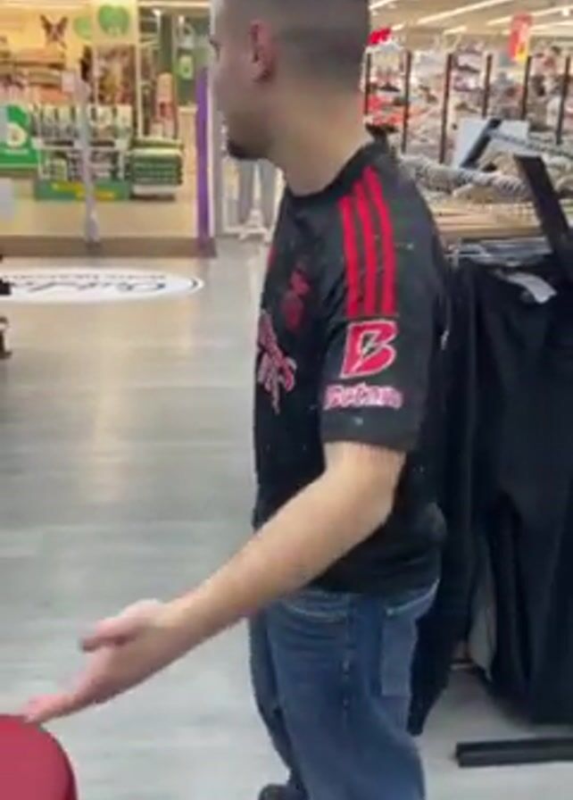 A young man wearing a black soccer jersey and jeans is standing in a store. He has brown hair and a short beard. The jersey has the word "SAGRES" printed on the upper back, the name "AKTURKOGLU" printed below that, and the number "17" printed below the name. He initially faces the camera with his hand extended. Then he turns his back to the camera and walks down an aisle in the store. He stops near some shoes and turns to face the camera again, smiling. The store appears to sell clothing, shoes, and pet supplies. There are other shoppers visible in the background.