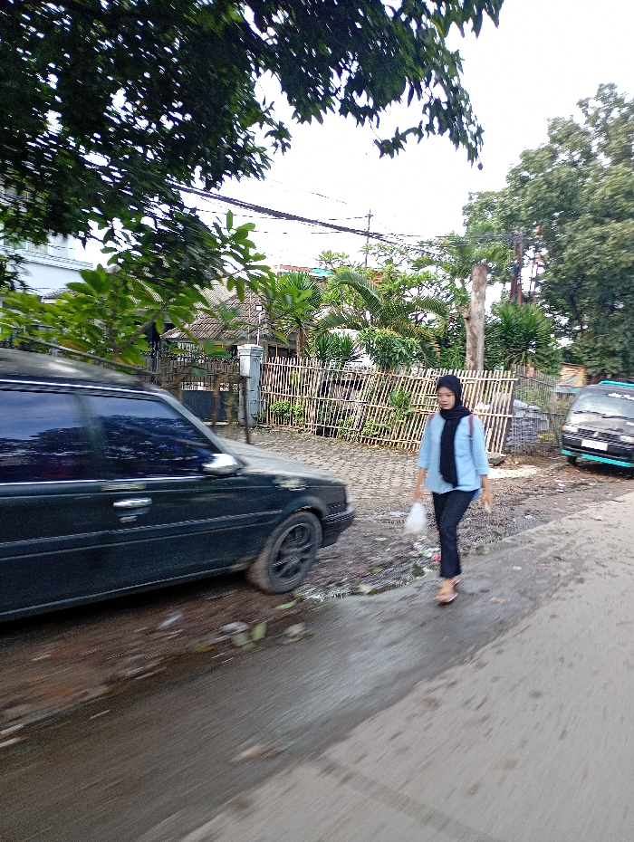 A street scene showcases a black car parked on the left, partially obscuring the view. A woman in a hijab, denim jacket, and dark pants walks along the edge of the road, carrying a white bag. A woven bamboo fence lines the background, bordering a property with trees and foliage. A second vehicle is visible in the distance on the right side of the image. Overhead, tree branches and foliage create a partial canopy, filtering the sunlight. The road surface appears wet and reflects the surroundings.