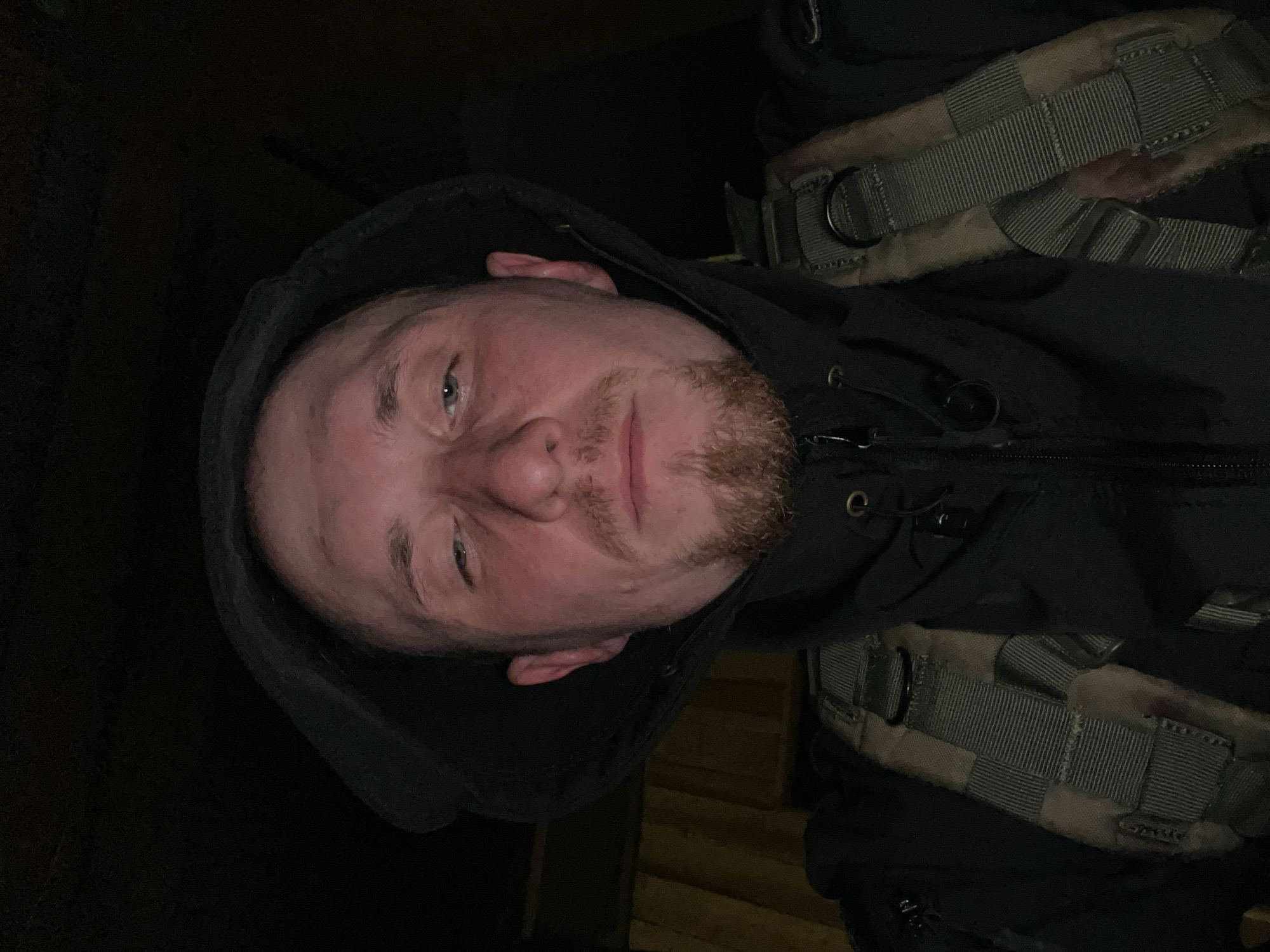 A male subject is depicted in a close-up, frontal portrait in dim lighting, located in Nizhnii Bugrysh, Russia. The individual possesses pale skin with minor redness on the cheeks and nose, light-colored eyes, and a short, light-brown beard. He is wearing a black hooded jacket, with the hood pulled over his head. Visible over his shoulders are tactical or robust backpack straps, characterized by a tan or olive-green padded base overlaid with dark grey webbing. The background is largely dark and indistinct, though a faint, lighter-colored, possibly wooden or textured surface is minimally visible to the left of the subject. The subject's gaze is directed towards the camera.