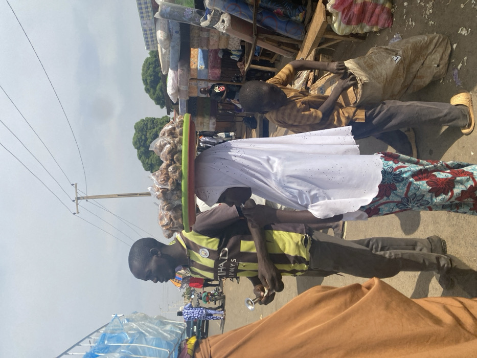 This image depicts an outdoor street scene in Kafanchan B, Nigeria, under bright daylight with a clear to partly cloudy sky. In the foreground, three individuals are prominently featured. To the immediate left, a person is partially visible, wearing a brown garment. Centrally, a dark-skinned adult male stands, oriented towards the left. He wears a yellow and dark-striped short-sleeve shirt with an "ETIHAD AIRWAYS" logo and dark pants. His mouth is slightly open. In his right hand, he holds a small, silver-colored, bell-shaped object. Next to him, a dark-skinned girl, appears to be in an interaction, wearing a white, embroidered headscarf and a patterned floral skirt. She balances a red and green tray on her head, which is laden with numerous clear plastic bags, each containing irregular brown items, likely foodstuffs. Her left hand is positioned near the man's right hand. To the right of the girl, a dark-skinned boy, wearing a light brown striped short-sleeve shirt and dark pants, is crouched over a large, light-colored sack on the ground, actively reaching into it. He wears light-colored slip-on sandals. The background reveals a bustling environment. On the far left, a blue vehicle and a motorcycle are visible on what appears to be a road. A wooden utility pole with multiple overhead power lines extends upwards on the left side of the frame. To the right, numerous mattresses of various colors and patterns are stacked, indicating a market stall. Wooden structures and benches are also present. Distant trees are visible under the sky. The ground appears to be a mix of packed earth and debris.