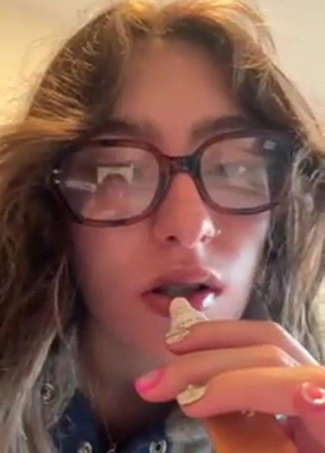 A young woman with medium-length brown hair and glasses is applying lip gloss