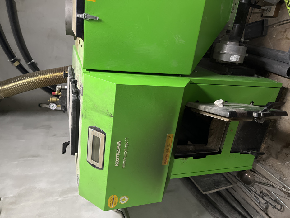 - "The image displays a bright green industrial-style pellet boiler system, identified by the branding "KOSTRZEWA Pellets Fuzzy Logic," situated in an indoor utility or boiler room" by FM-W4GQK2, licensed under CC BY 4.0