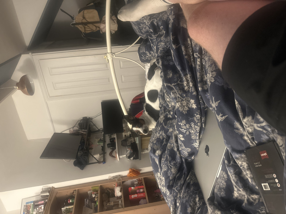 The image depicts an interior bedroom scene, located in Salisbury, United Kingdom. The perspective is low, from the viewpoint of an individual lying in bed, showing their bare right leg and left foot clad in a white sock, partially covered by black shorts or undergarments in the foreground. A small, short-haired dog with white fur and black patches is centrally positioned on the bed, lying down with its head raised, looking towards the left side of the frame. The bed is covered by a blue duvet featuring a light-colored floral or leaf pattern. A silver laptop, identifiable as an Apple MacBook, rests on the duvet in front of the dog. A black box, possibly containing a mobile phone or accessory, is visible on the duvet in the lower left. The background shows a cluttered room. To the left, a tall wooden bookshelf contains various personal items including books, framed pictures, decorative objects, and bottles. Further back, a white wall features a black metal shelving unit holding clothing, shoes, and miscellaneous items, with two black flat-screen monitors mounted on or resting on the shelves. One monitor is positioned vertically. A white door is visible towards the right-center, beneath a copper-colored pendant light fixture hanging from the ceiling. Dark ceiling beams run across the top of the frame, suggesting a sloped ceiling or attic room. A white metal bed frame headboard is partially visible, extending from the right towards the center. To the far right, a brown backpack or bag hangs from a hook or part of the bed frame. The room is dimly lit, suggesting indoor artificial lighting.