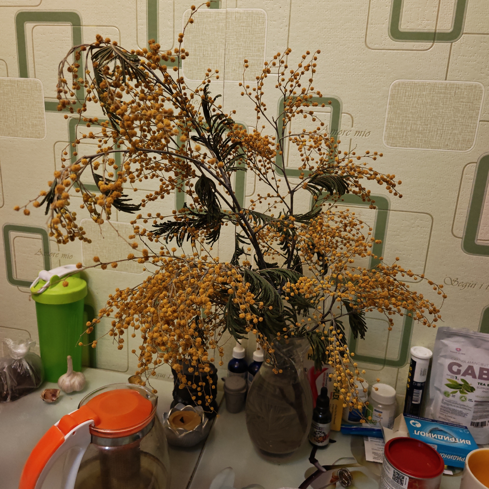 cluttered tabletop scene, dominated by a bouquet of mimosa flowers in a glass vase. The flowers are characterized by their yellow, spherical blossoms and dark green, feathery foliage. In the foreground, there is an orange-lidded glass pitcher and a green shaker bottle, positioned to the left of the vase. Nearby are heads of garlic and a plastic bag containing a dark substance. To the right of the vase is a chaotic assortment of items including medication bottles, supplements (including a bag of Gaba supplement), a red tin can, and boxes with Cyrillic text. The backdrop is a wall adorned with a geometric patterned wallpaper in shades of beige and green. The wallpaper features the phrase "Amore mio." Given the Cyrillic text on some of the items, it is likely the location is in a Russian-speaking area, such as Rostov, Russia. The presence of various supplements and medications suggests a focus on health or wellness. The general disarray indicates a workspace or storage area that is not primarily for display.