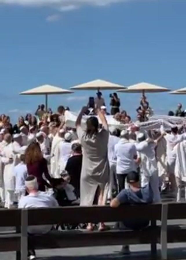 large group of people gathered in an open outdoor space, possibly a plaza or park, under a bright blue sky with scattered clouds. The crowd appears to be celebrating or participating in a cultural event. Many people are dressed in white attire, and they are gathered around a central area where several individuals are holding up a white sheet or cloth, which they are moving rhythmically. There are several people on the fringes of the crowd who are not dressed in white. Several people are taking photos or recording videos with their mobile devices. In the background, there are white sun umbrellas and additional observers. A bench sits in the foreground, and a tall palm tree is visible to the side. The overall atmosphere appears celebratory and communal.