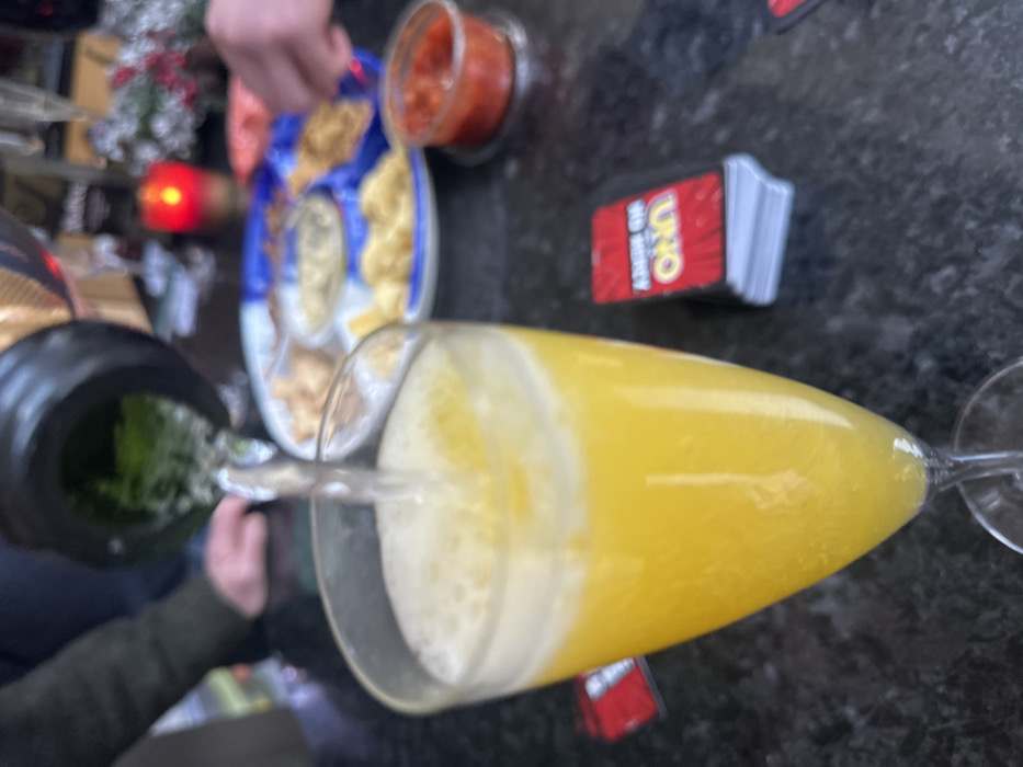 A photograph captures a close-up scene occurring on a dark, polished surface, likely a countertop or table, in Wealden, United Kingdom. The central action involves a dark green bottle, held by an unseen individual, pouring a clear, effervescent liquid into a stemmed glass. The glass is approximately three-quarters full of a frothy, orange liquid, indicative of a Mimosa cocktail being prepared. In the background, a blue and white segmented platter displays various snacks, including chips or crisps and dips. Adjacent to the platter, a clear plastic container holds red salsa. A human hand is visible near the platter, suggesting interaction with the food. Further into the background, a lit red candle emits a soft glow, and indistinct green foliage with red accents is present, suggesting decorative elements. Two stacks of "UNO" playing cards are visible on the table surface, indicating a game is present. Part of a person's arm, dressed in a dark garment, is discernible in the upper left portion of the frame, indicating the presence of multiple individuals.