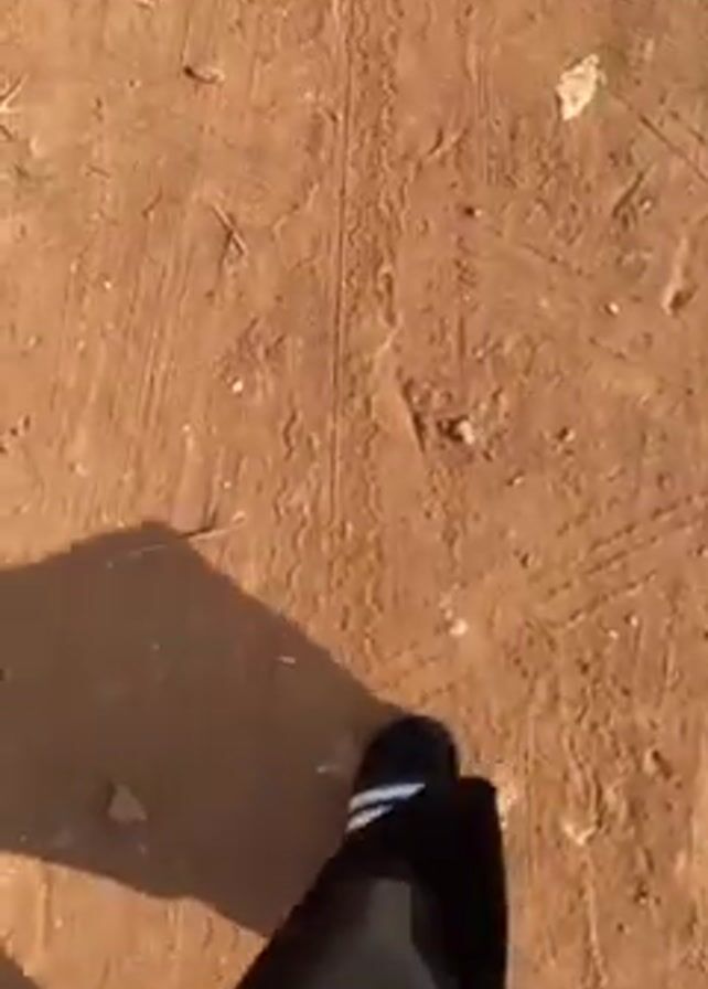 A person is walking on a dirt path. The person is wearing black pants and black and white Adidas slides. The path is reddish-brown and has tire tracks and scattered debris. The sun is shining and casting a shadow of the person walking. The person is holding a pink plastic bag in their hand.