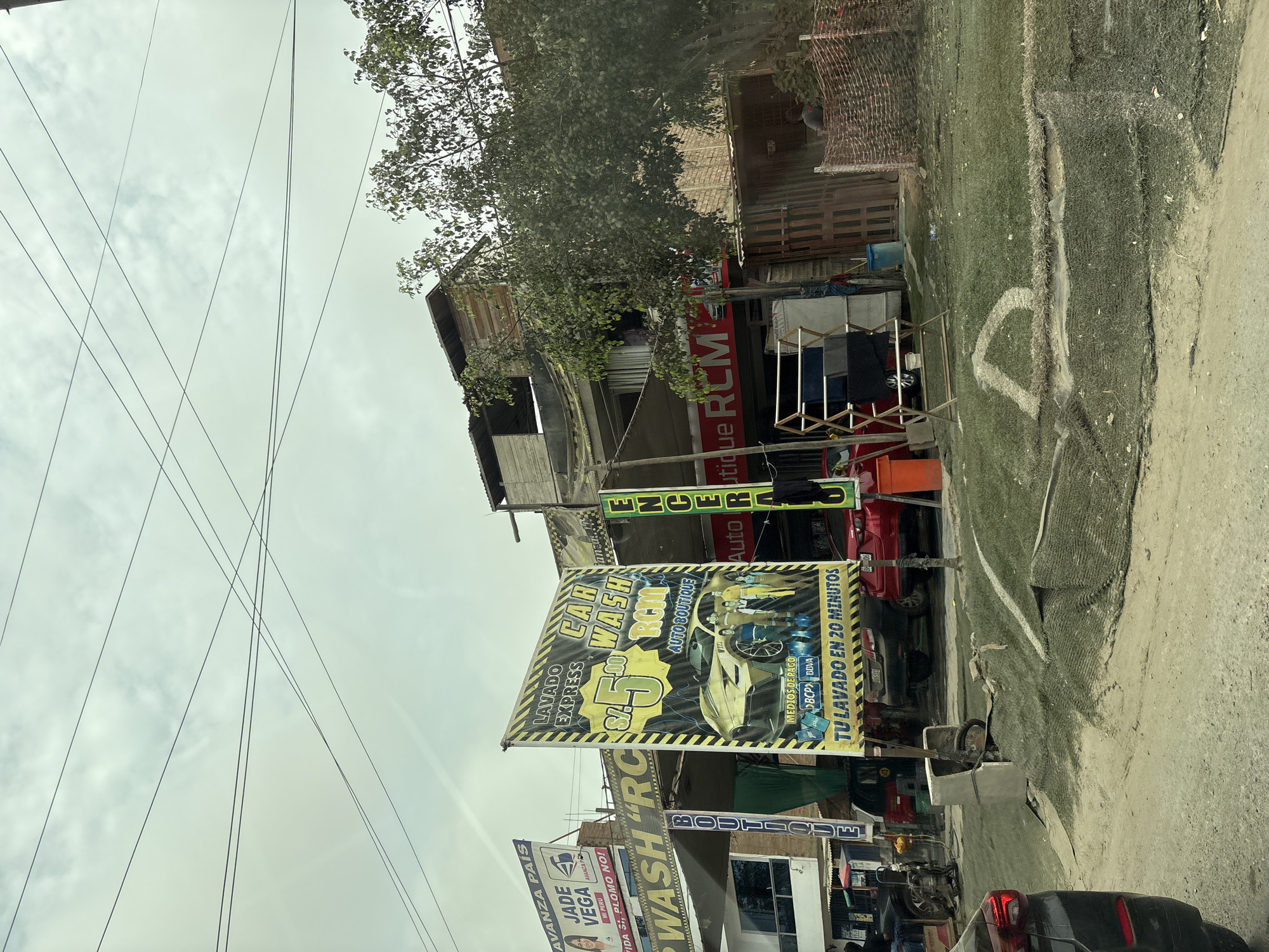 The image depicts a street scene in Mi Perú, Peru, with various signs and buildings. The primary focus is on a banner advertising a car wash called "Lavado Express" for S/. 5.00, operated under the name "RCM Auto Boutique." The banner advertises a "Lavado en 20 minutos." The scene also includes multiple other signs indicating businesses, including "Jade Vega Mi Perú" and other auto businesses, such as "WASH RC Boutique." A multi-story building is visible behind the signs. The environment includes a street, sidewalk, and overhead power lines. A tree is visible. Several motorcycles and vehicles are parked along the street. A sign for "Auto Rutique RCM" is visible above the ground level.