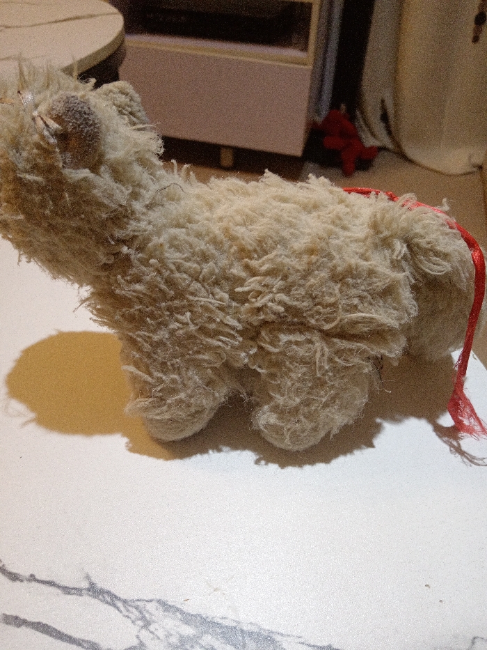 In a residential setting within Ijoko, Nigeria, a light cream-colored, shaggy stuffed animal, resembling a lamb or a small shaggy dog, is centrally positioned on a white or off-white surface exhibiting subtle gray veining. The stuffed animal possesses matted fur, a distinct dark circular eye on its head, and a red string or ribbon trailing from its posterior. A pronounced shadow extends to the left of the object. The background is out of focus, revealing a curved, light-colored surface to the upper left, a light pink or beige cabinet on short legs to the right, and a small red object resting on a lower surface behind the stuffed animal. No individuals are present in the scene.