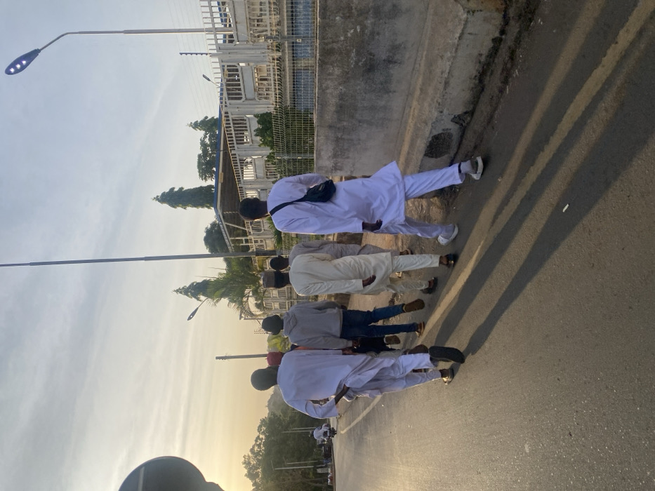 A line of people stand on a road or walkway. Most wear traditional white clothing; one wears jeans and a gray jacket. They face away from the camera, possibly praying. Buildings and trees stand in the background, illuminated by the evening light. Shadows stretch across the pavement, and a streetlamp is visible on the left. The scene conveys a sense of tradition and community.