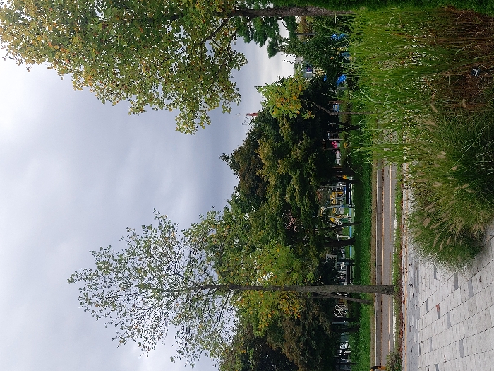 The image displays an outdoor park environment in 김포시, South Korea, under an overcast sky. In the foreground, a sidewalk constructed of rectangular gray and dark gray pavers runs along the left. Adjacent to the right is a planting bed containing tall, green ornamental grasses. An asphalt road, featuring a single white lane marker, separates the foreground elements from a vegetated park area. Between the sidewalk and the road, a slender tree with sparse, green and partially yellowed leaves stands left of center. A second, larger tree with denser green and yellow foliage is partially visible on the far right. The park area beyond the road is densely vegetated with numerous trees, exhibiting a mix of green and autumnal yellow leaves. Visible through the trees within the park are various recreational structures, including a blue apparatus, metallic climbing frames or exercise equipment (one appearing white and circular), and two dark park benches. No individuals or animals are present in the scene.